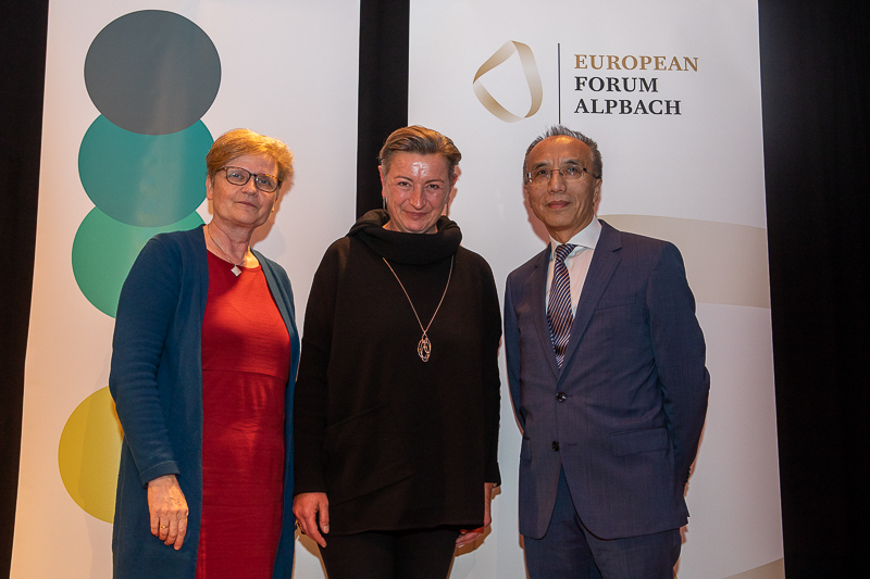 Eine tragfähige Beziehung zwischen Europa und China gestalten – aber wie? Über diese Fragestellung diskutierten S.E. Xiaosi Li, Botschafter der Volksrepublik China in Österreich, Susanne Weigelin-Schwiedrzik, Universitätsprofessorin für Sinologie am Institut für Ostasienwissenschaften sowie Dekanin der Philologisch-Kulturwissenschaftlichen Fakultät der Universität Wien beim Alpbach-Dialog im Berio-Saal des Wiener Konzerthauses. Die Moderation wurde von Verena Nowotny, Partner, Gaisberg Consulting übernommen.