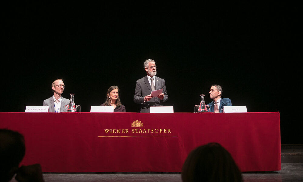 The Ambassador of Brazil, H.E. Jose Antonio Marcondes de Carvalho, the Museum in Progress and the Wiener Staatsoper invited to a festive opening of the „Safety Curtain“ 2021/22 by Brazilian artist Beatriz Milhazes. The Swiss curator, art historian, critic and publisher Bice Curiger spoke about the work of the renowned artist, the musical programme was provided by the Wiener Staatsoper Stage Orchestra and Martin Schläpfer created a short ballet choreography inspired by Beatriz Milhazes‘ Safety Curtain.