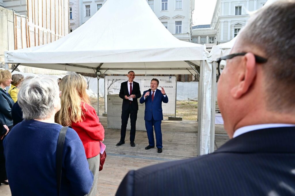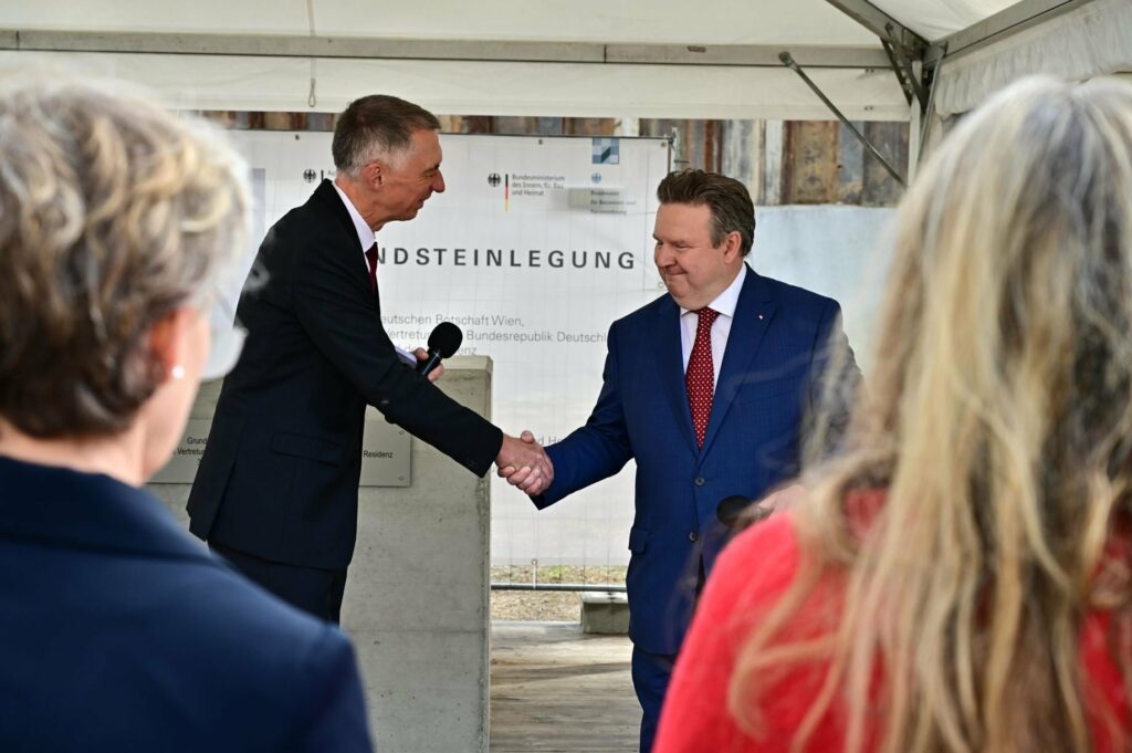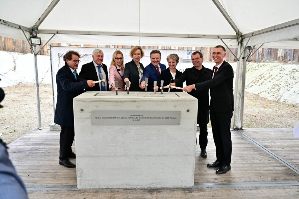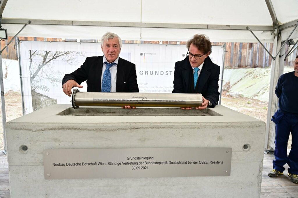 In Anwesenheit des deutschen Botschafters in Österreich, S.E. Ralf Beste, der Ständigen Vertreterin Deutschlands bei der OSZE, Gesa Bräutigam, dem Wiener Bürgermeister Michael Ludwig und dem Bundestagsabgeordneten Alois Karl wurde am 30. September der Grundstein für den Neubau der Deutschen Botschaft, Ständigen Vertretung Deutschlands bei der OSZE und der Residenz im 3. Gemeindebezirk Landstraße gelegt.
