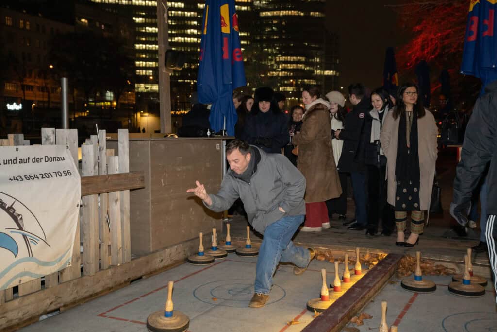 KR Prof. Mag. Gertrud Tauchhammer, Owner of Diplomatic SOCIETY Magazine, and Mag. Tanja Tauchhammer, Editor-in-Chief of Diplomatic SOCIETY Magazine, invited to the traditional Junior Diplomats Get-Together for deputies, ministers, diplomatic secretaries and other diplomatic staff and company at Feuerdorf (Donaukanal). After a „welcome punsch“, the international diplomats from Albania, Australia, Bangladesh, Bosnia and Herzegovina, Canada, Cyprus, Ghana, Great Britain, Greece, Ireland, Italy, Japan, Kosovo, Moldova, Mongolia, Russia, Serbia, South Africa, Tajikistan and the US as well as students from the Diplomatische Akademie Wien – Vienna School of International Studies had the chance to try out the traditional Austrian winter activity „ice stock shooting“ before they were invited into the wooden huts of Feuerdorf for a barbecue and drinks. The evening was a great opportunity for the guests to share their experiences and meet new colleagues in a cozy atmosphere.