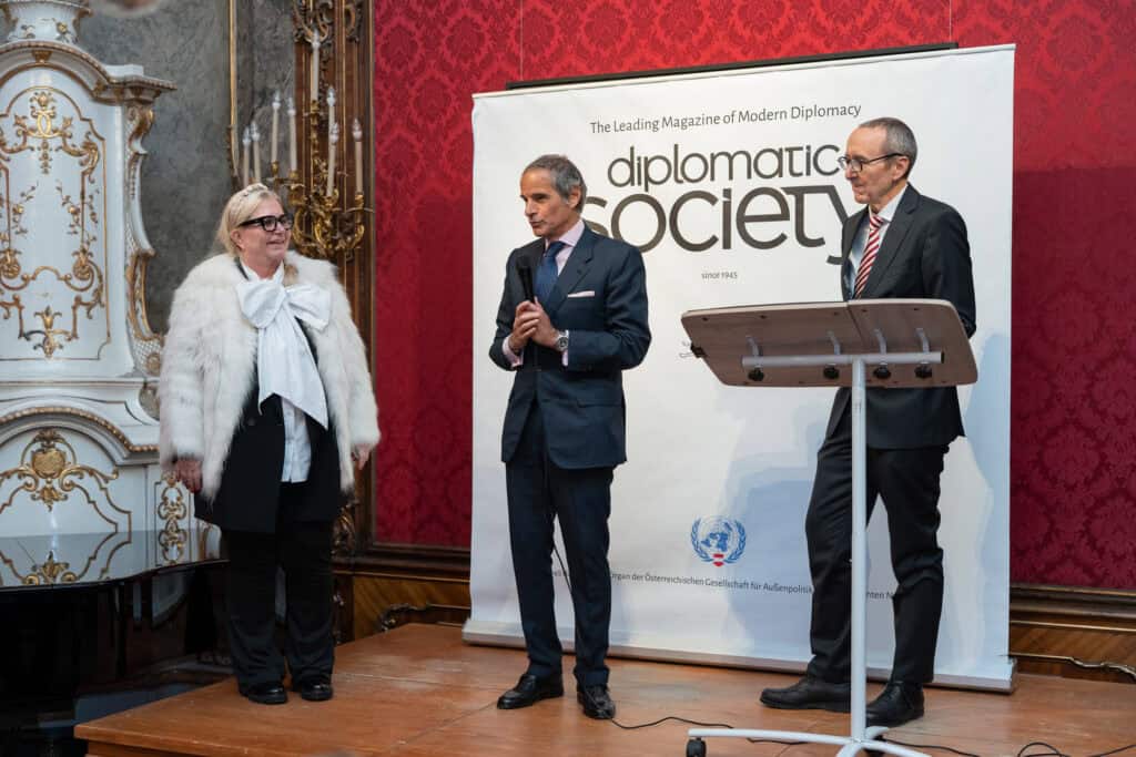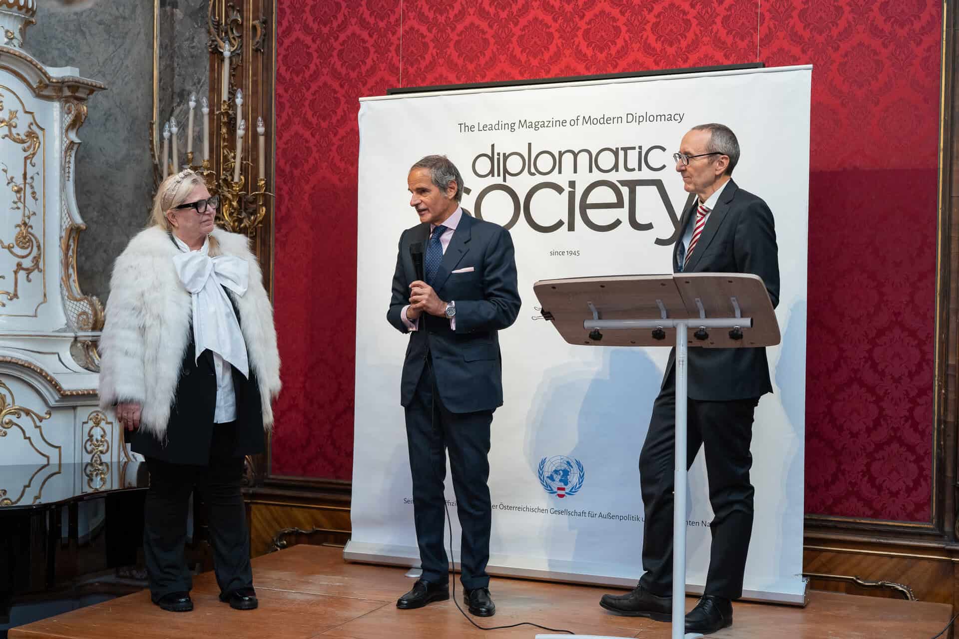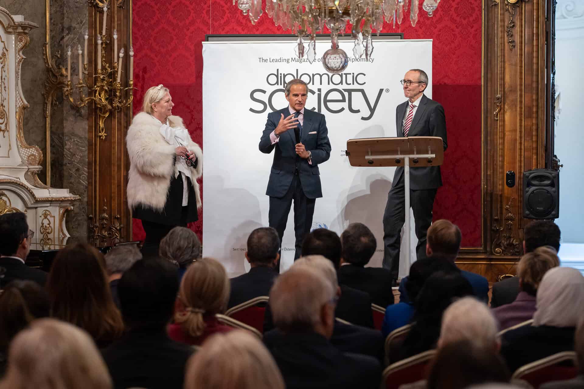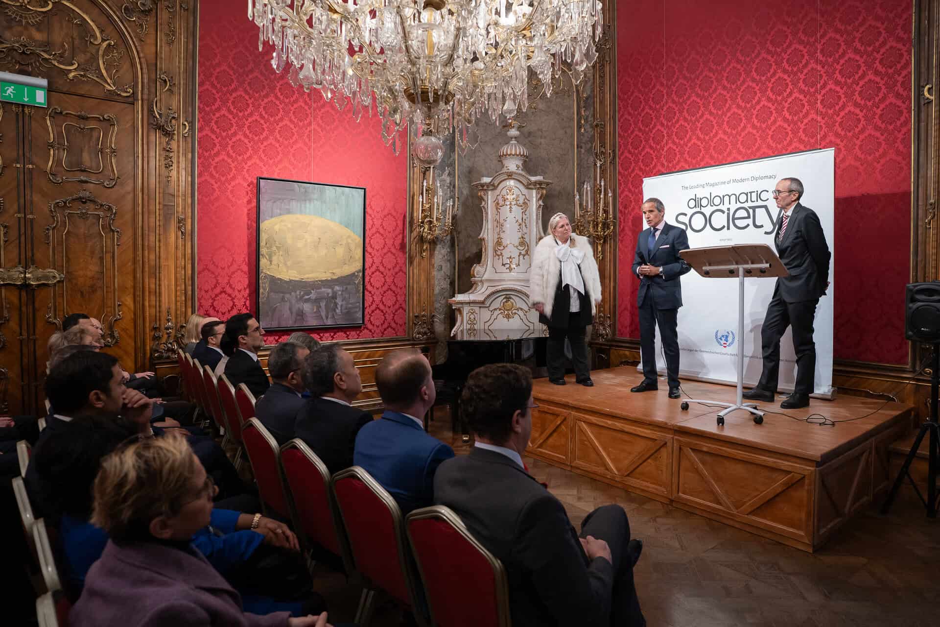 After the welcome words by Ms. TAUCHHAMMER and an introduction by the moderator of the morning, Ambassador Stefan Scholz, Head of Department for Sub-Sahara Africa and the African Union of Austrian Federal Ministry for European and International Affairs, GROSSI addressed the numerous international guests, pointing out IAEA’s critical role in fostering peaceful nuclear applications, mitigating global crises, and maintaining international security. Then, Ambassador Maximilian Hennig, Head of the Protocol Department of the BMEIA, thanked him for his and the IAEA’s work and also pointed out the importance of Diplomatic SOCIETY’s contribution to a lively exchange between nations and cultures.