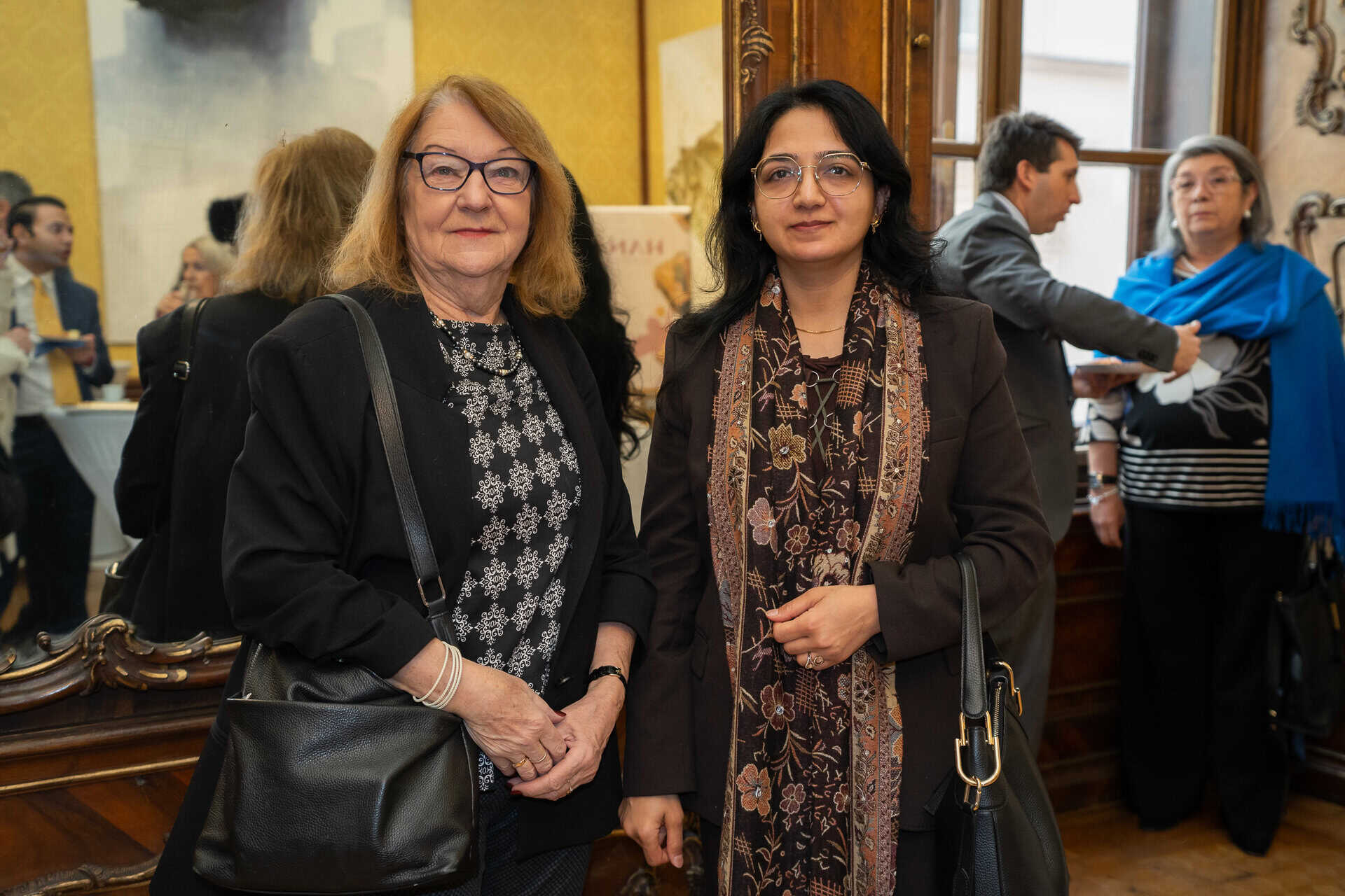 In the second part of the event, the new Ambassadors (accredited since July 2025) were welcomed with individual fanfares by Austrian composer and trumpeter Leonhard LEEB. The Diplomats from Brazil, H.E. Eduardo PAES SABOIA, Canada, H.E. Alison L. GRANT, Estonia, H.E. Arti HILPUS, Guatemala, H.E. Gabriel ORELLANA ZABALZA, Kyrgyzstan, H.E. Nurzhana SHAILDABEKOVA, Lao DPR: H.E. Khampheng DOUANGTHONGLA, Lebanon, H.E. Cynthia CHIDIAC, Poland, H.E. Zenon Henry KOSINIAK KAMYSZ, Sweden, H.E. Annika BEN DAVID and USA, H.E. Arthur Graham FISHER joined the Director General, Ms. TAUCHHAMMER, Mr. HENNIG and Mr. SCHOLZ on stage for a group picture before the delicious buffet provided by HANA and a tea corner with sweets provided by the Ambassador of Morocco to Austria and Vice-Chair of the IAEA Board of Governors, H.E. Azzeddine FARHANE, was opened. In the stately athmosphere of the historic Palais, the guests then had the chance to network and exchange their impressions of the morning.