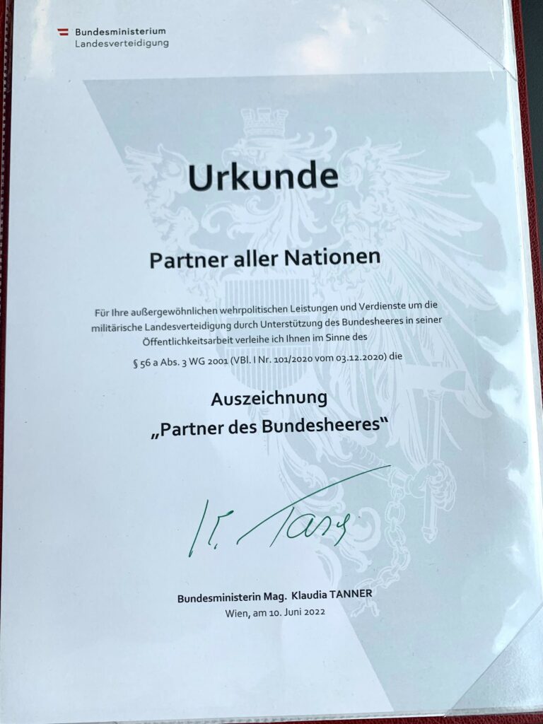 Im Rahmen des Tags der steirischen Verbände des Österreichischen Bundesheeres und der Partnerschaftsveranstaltung der Direktion 1 des Bundesheeres am 10. Juni 2022, verlieh Verteidigungsministerin Klaudia Tanner in der Belgier Kaserne Graz an den Dachverband aller österreichisch-ausländischen Gesellschaften-PaN in Würdigung der langjährigen aktiven Partnerschaft eine Anerkennungsurkunde.