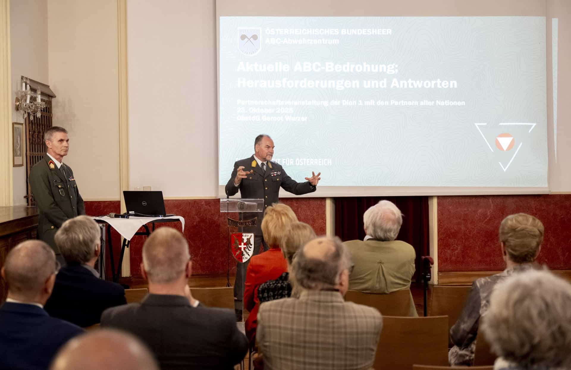Der Dachverband aller österreichisch-ausländischen Gesellschaften – PaN und die Direktion 1 / Kommando der Landstreitkräfte & Spezialeinsätze des Österreichischen Bundesheeres luden am 23. Oktober 2025 zum Vortrag von Oberst des Generalstabdienstes Mag. Gernot Wurzer über „Aktuelle ABC-Bedrohung an ausgewählten Konfliktbeispielen. Herausforderungen und Antworten“ in den Festsaal des Standortkasinos der Maria-Theresien-Kaserne ein.