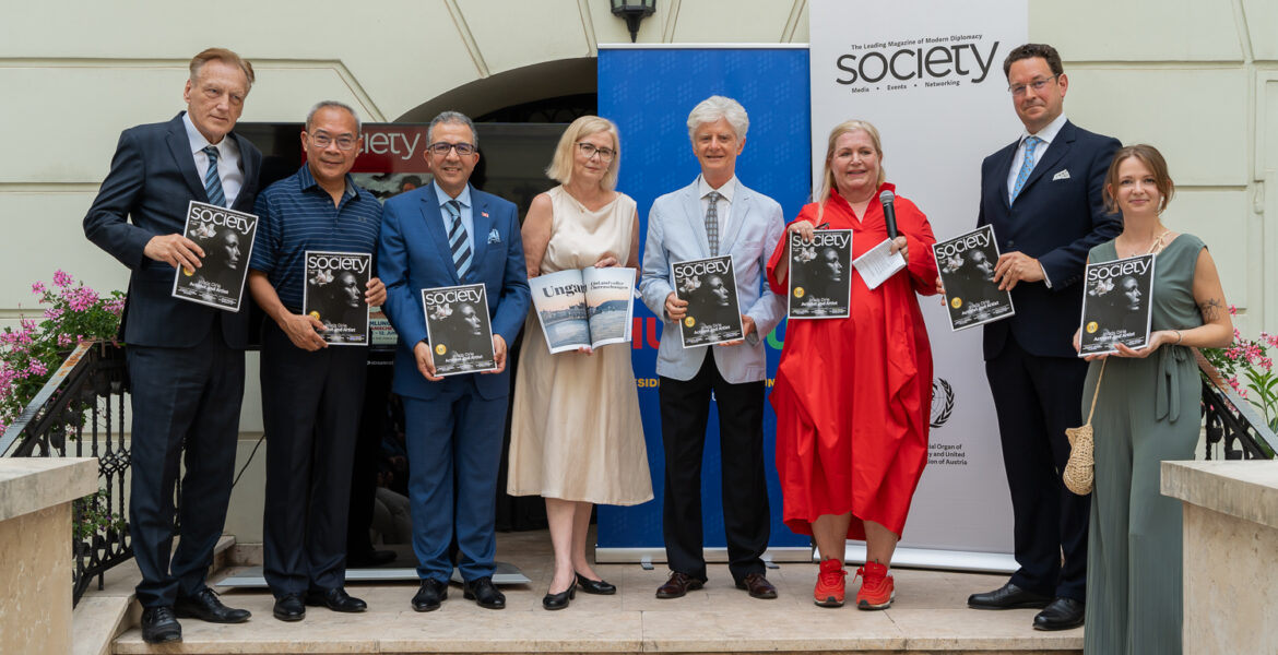 SOCIETY Publisher Gertrud Tauchhammer and the Ambassador of Hungary to Austria, H.E. Edit Szilágyiné Bátorfi, invited to a summer party on the occasion of the presentation of the new SOCIETY issue with a special focus on Hungary, who took over the EU council presidency on July 1.