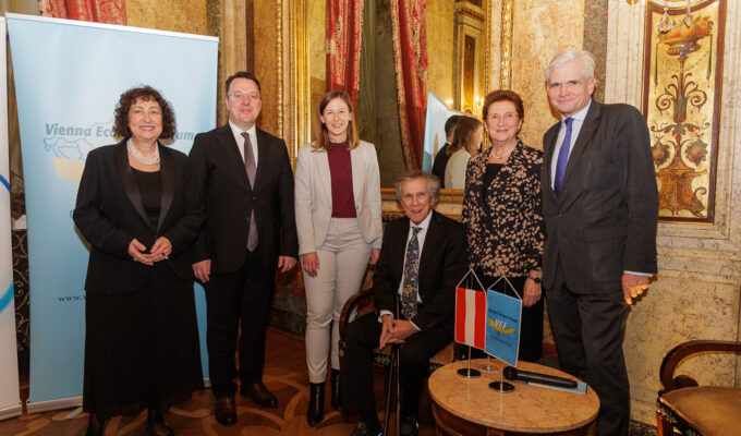 After the speeches, Ms. Tauchhammer called the present Ambassadors featured in the magazine – H.E. Azzeddine Farhane, Ambassador of the Kingdom of Morocco and H.E. Li Song, Ambassador and Permanent Representative of China to the UN and other International Organizations – and the SOCIETY guest authors, former Trade Delegate Rudolf Thaler and former Ambassador Klaus Wölfer – to come on stage to reveal the newest issue of SOCIETY together.