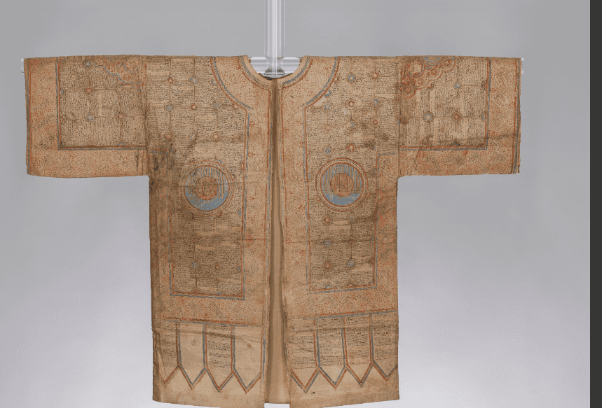 A special place is also occupied by the Baburid talismanic robe — a protective garment created in court workshops to safeguard and bless its wearer. Dense cotton fabric is entirely covered with Quranic texts, as well as the shahada and the 99 names of Allah. On the back, there is a verse from Surah Yusuf (12:64): “Indeed, Allah is the best guardian, and He is the most merciful of the merciful.”